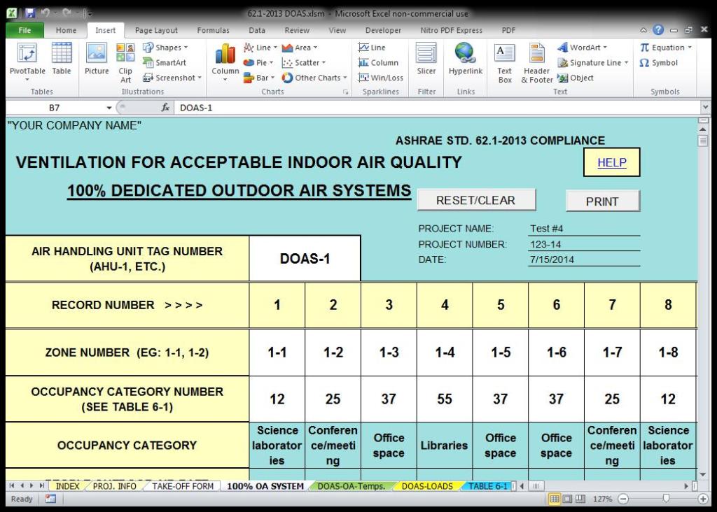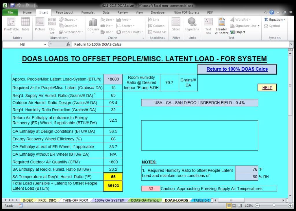 DOAS – Required Outdoor Air calculations for compliance with ASHRAE Standard 62.1-2013, and psychrometric calculations to determine supply air condition to offset internal Latent Loads. ASHRAE Standard 62.1-2013 “Ventilation Rate Procedure” Compliance – I-P (Inch-Pound) units, Calculations, Take-off Forms, Tables, & Diagrams, Calculations for DOAS Air Handling Unit Design, and Calculation Assumptions, Determining Occupancy (Zone Population), Air Distribution Configuration (Table & Diagrams), DOAS Loads to offset internal Latent Loads, Compliance Documentation, Extensive Help Files and “Extras”