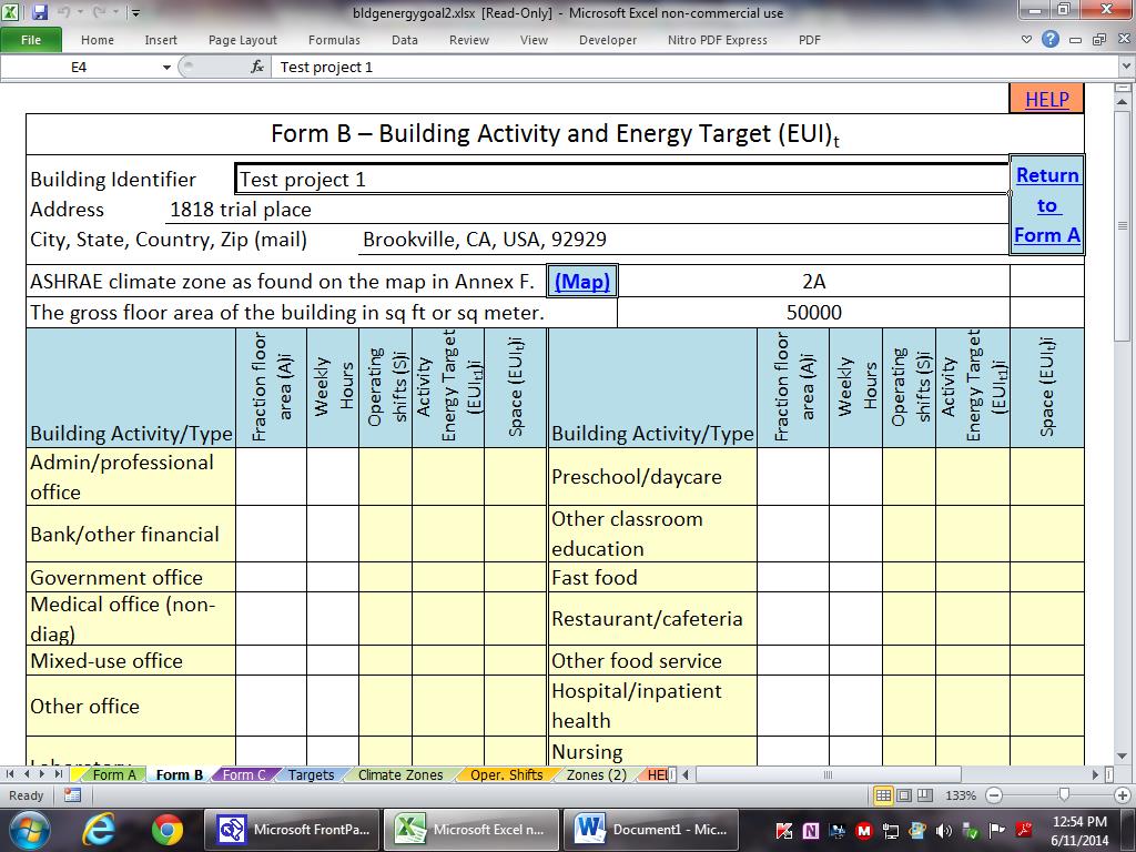Energy Goal Calculations and Interactive Forms (A, B, and C) for compliance with ASHRAE Standard 100, “Energy Efficiency in Existing Buildings”. “Compliance Requirements” Form A, “Compliance with ASHRAE Standard 100” Form B, “Building Activity and Energy Target” Form C, “Energy Use Reporting”, “Building Activity and Energy Target” Table B-1, “US and Canada Climate Zones” Table 7.3, “Building Operating Shifts Normalization”, “Help” file