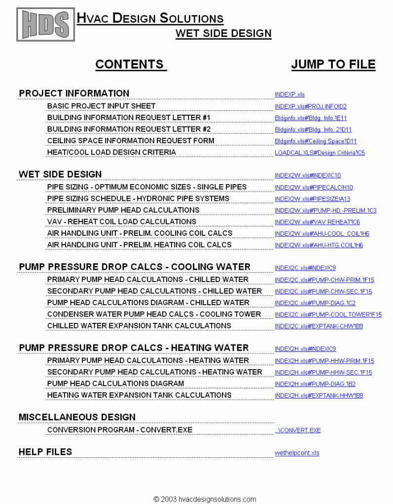 Over (20) Programs and Forms, including: Pump Head Calculations – Primary, Secondary, & Condenser Water (Cooling Tower), Hydronic Pipe System Sizing – Optimum Sizes, Coil Psychrometrics & GPM Calcs, Expansion Tank Sizing – CHW & HHW, Project Information Request Letters, Help Files and “Extras”