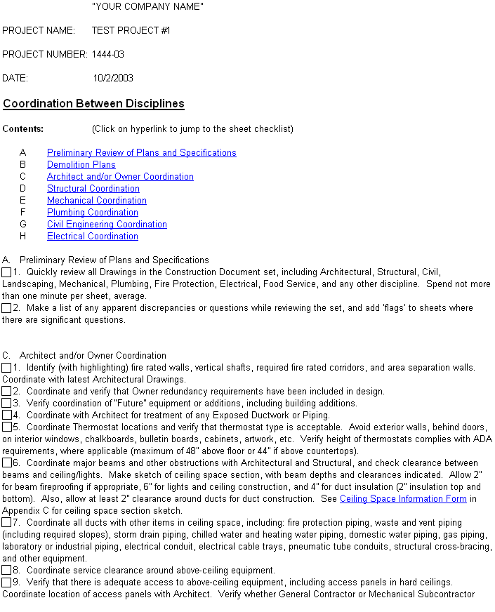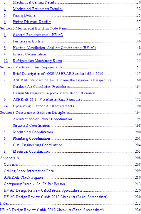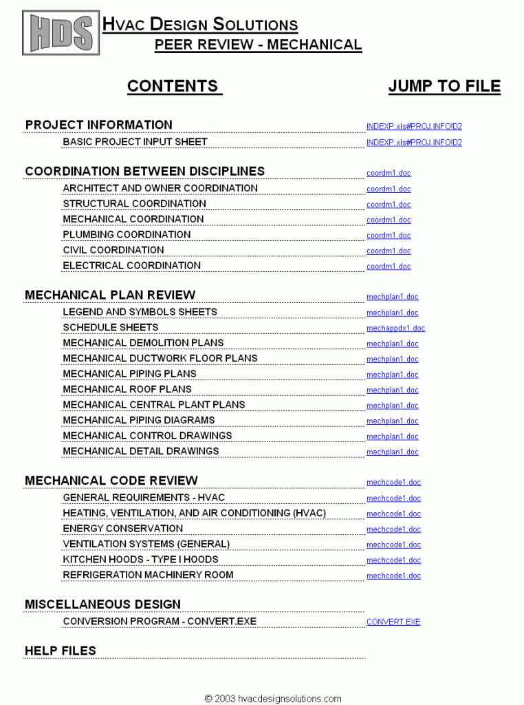 Over (110) Pages and Spreadsheets, including: Coordination Between Disciplines, Mechanical Plan Review Items, Mechanical Equipment Schedule Items, Mechanical Central Plant Items, Mechanical Detail Drawing Review Items, Mechanical Code Review Items, Help Files and “Extras”
