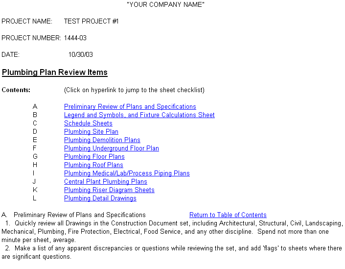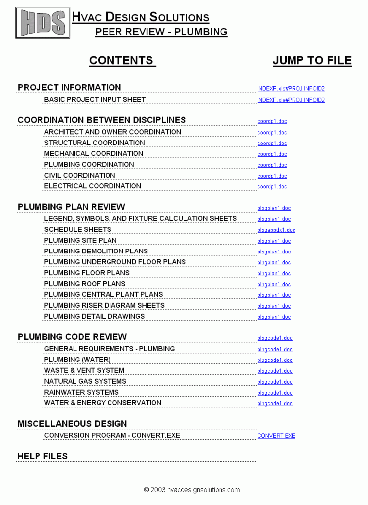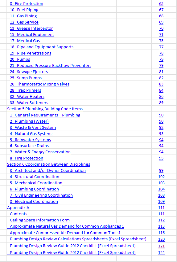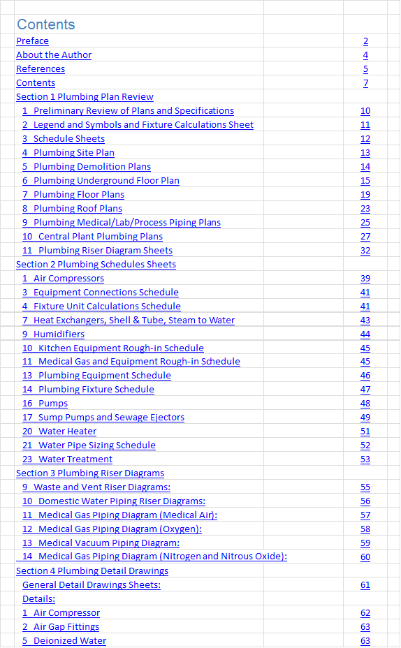 Over (70) Pages and Spreadsheets, including: Coordination Between Disciplines, Plumbing Plan Review Items, Plumbing Equipment Schedule Items, Plumbing Riser Diagram Items, Plumbing Detail Drawing Review Items, Plumbing Code Review Items, Help Files and “Extras”